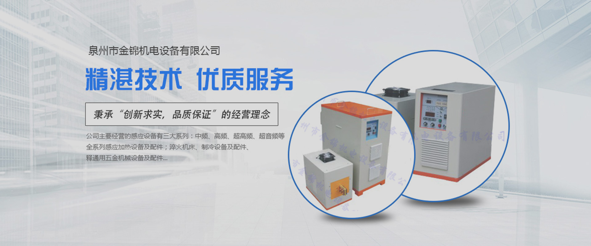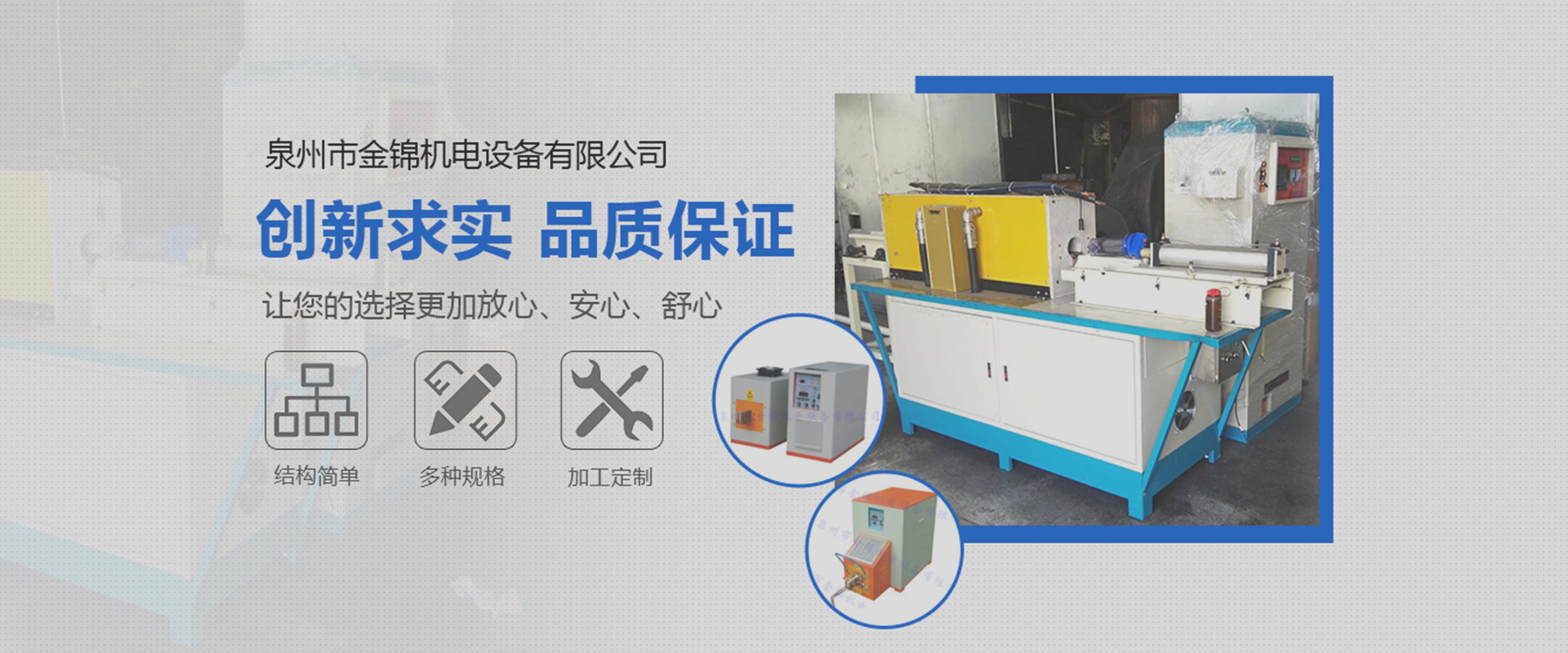 ??泉州市金錦機電設備有限公司,是一家專業(yè)生產銷售感應加熱設備與優(yōu)化解決方案的高新技術企業(yè)。公司自2006年成立以來,以精湛的技術、優(yōu)質的服務、優(yōu)良的產品贏得了廣大用戶的認可和信賴。產品銷售于全國各地。公司一貫堅持“立足本職,敢于承擔”的工作作風,秉承“創(chuàng)新求實,品質保證”的經(jīng)營理念,在感應加熱行業(yè)中不斷發(fā)光發(fā)熱…